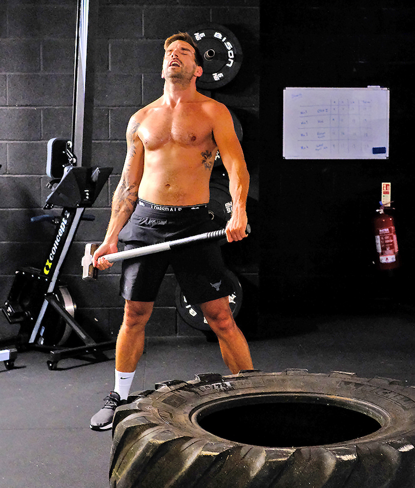 “The goal has never been a six-pack,” he assures me as he lugs a sledgehammer overhead and slams it down on a tractor tyre. “I don’t believe that’s where happiness lies. I look for what effect it has on my mind.”