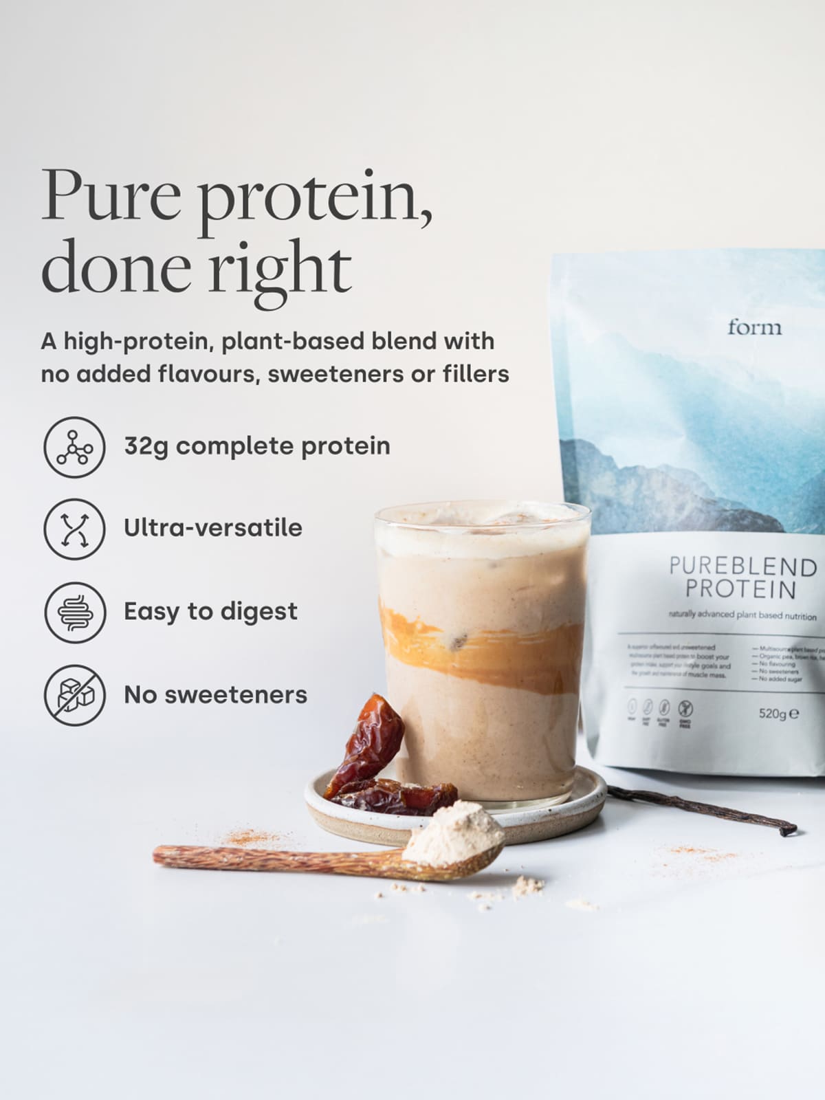 With no sweeteners and no flavouring, just Form’s complete vegan protein base of organic pea, brown rice, pumpkin seed protein it’s the perfect base for your own smoothies creations or for cooking and baking. If you’re looking for a flavoured protein check out our Performance vegan protein powder.