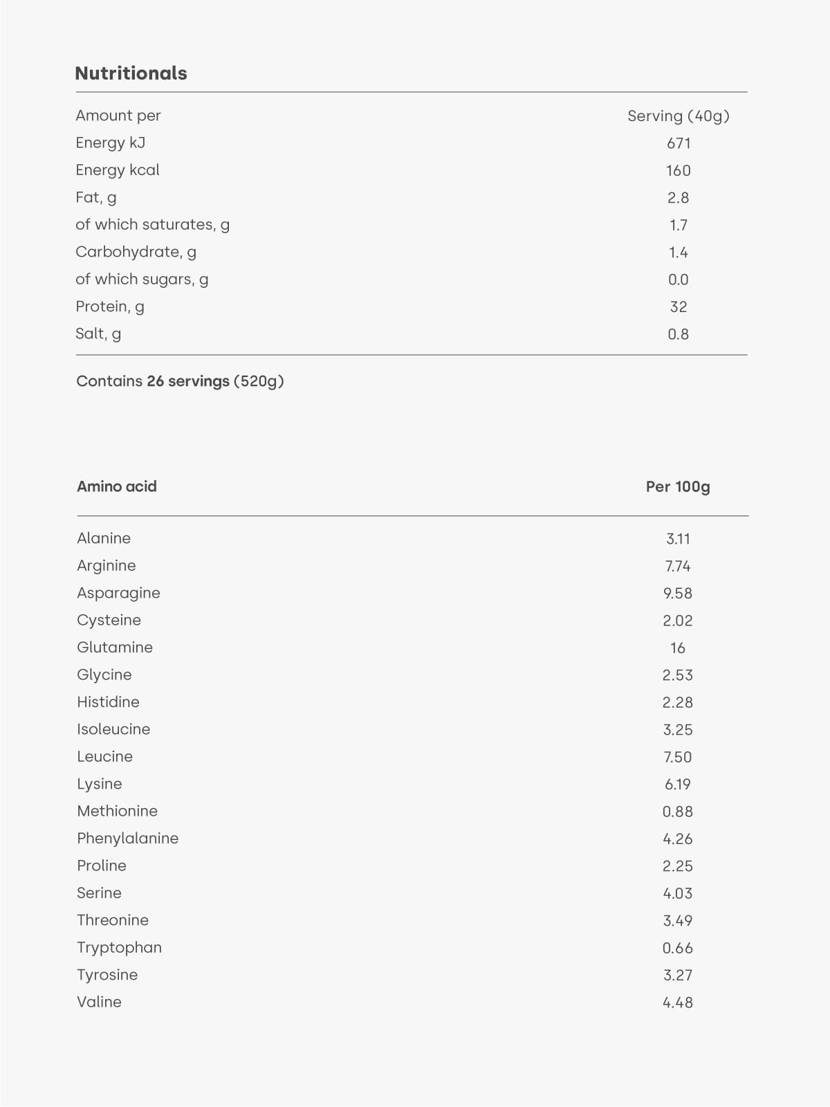 | Amino Acid | per 100g |