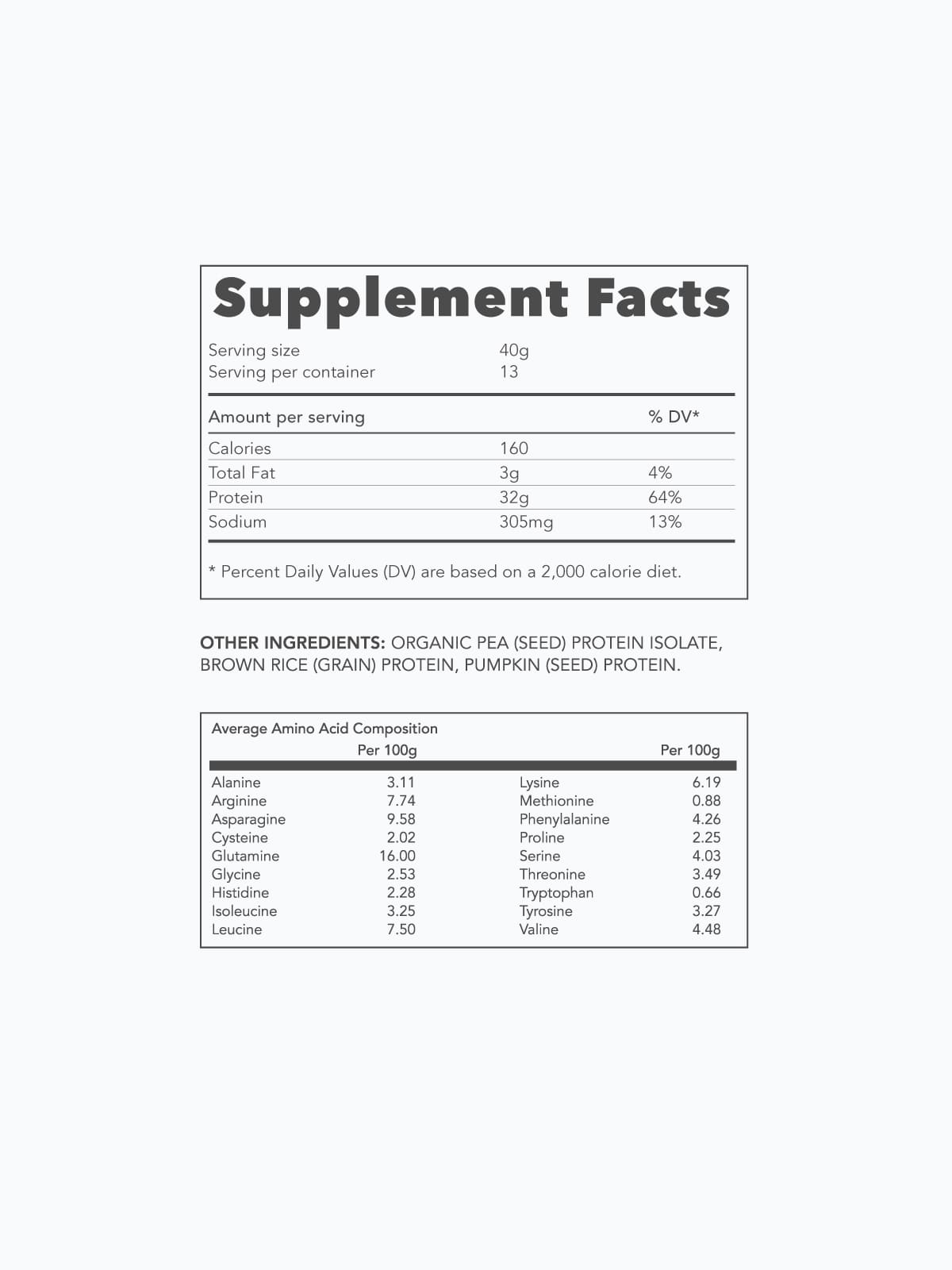 Our own blend of organic pea protein with brown rice, pumpkin seed protein
